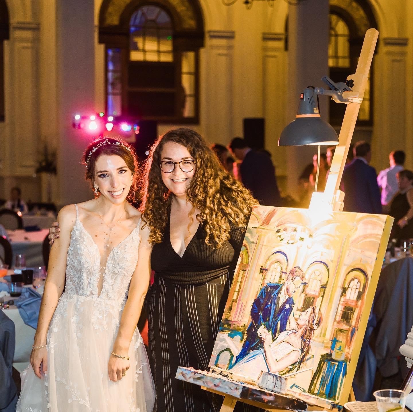 I’ve been painting wedding photos and couples portraits for nearly a decade as a commission-based artist, but in recent years I’ve been enjoying the interactive and personal experience of painting live at weddings and events. The thrill of painting for people to watch in real time is so fun for me and I fell in love with this work! My painting style is loose and chunky while making sure those small details capture the moment and the feel of each event. At some weddings I’ve started collaborating with the younger guests, they get to add some brushstrokes and be a part of process!