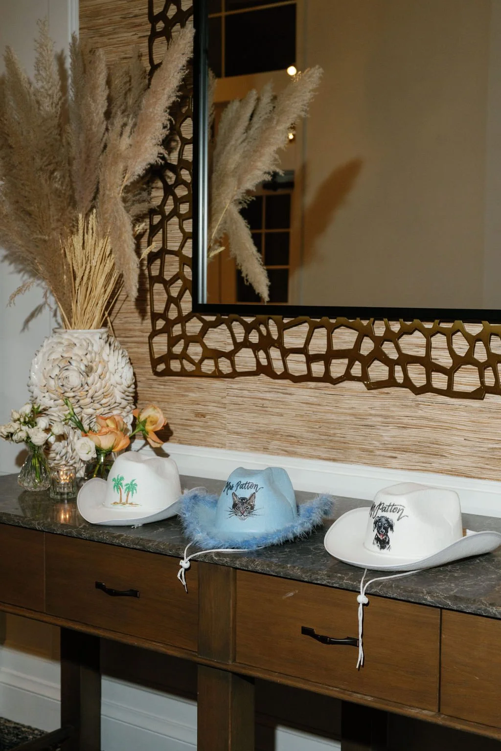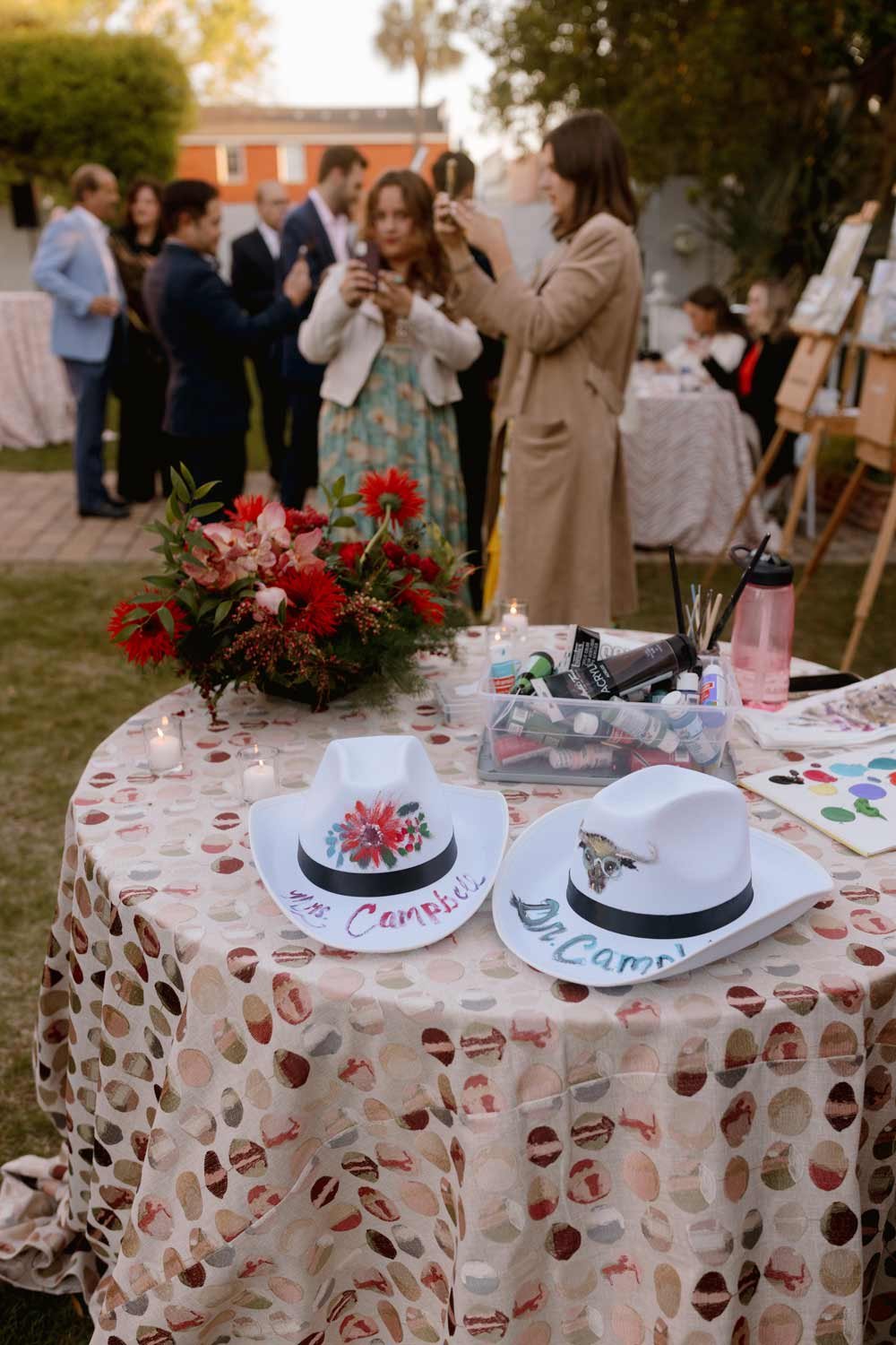 Elevate your reception with custom cowboy hats to wear and to have as a memory of your event. These cowboy hats are painted custom to request on-site and are completed live within 5 minutes. Beyond entertainment, these hats will become a memorable keepsake for your guests to cherish.