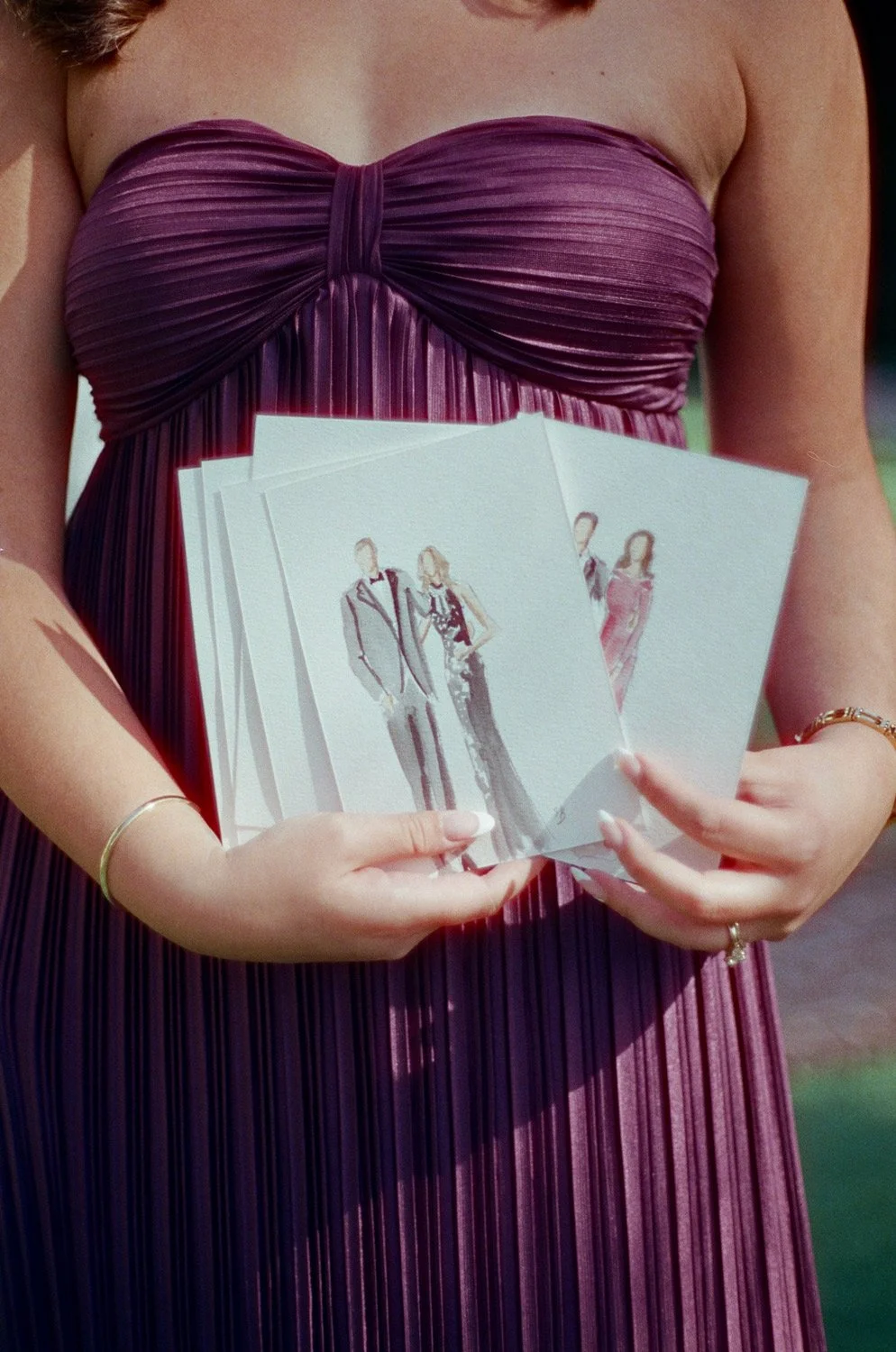 A more stylized take on live guest portraits, with an emphasis on outfits and textures. Featuring elongated figures and expressive linework making them especially well- suited for fashion-forward events or weddings with a standout dress code.